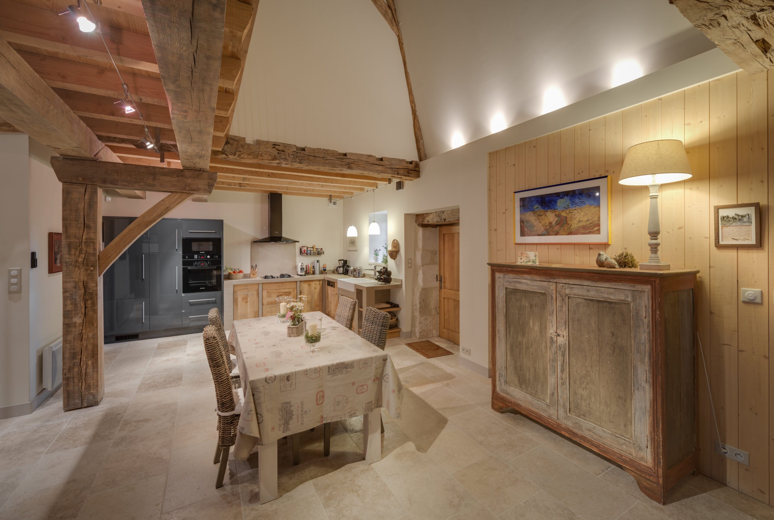 De style campagnard et chaleureux, le vaste séjour avec cuisine de la Bergerie est éclairé par sa large baie vitrée offrant au regard l’ensemble du site et le lac de la Nette qui joue à cache-cache entre les vieux chênes bordant le parc.